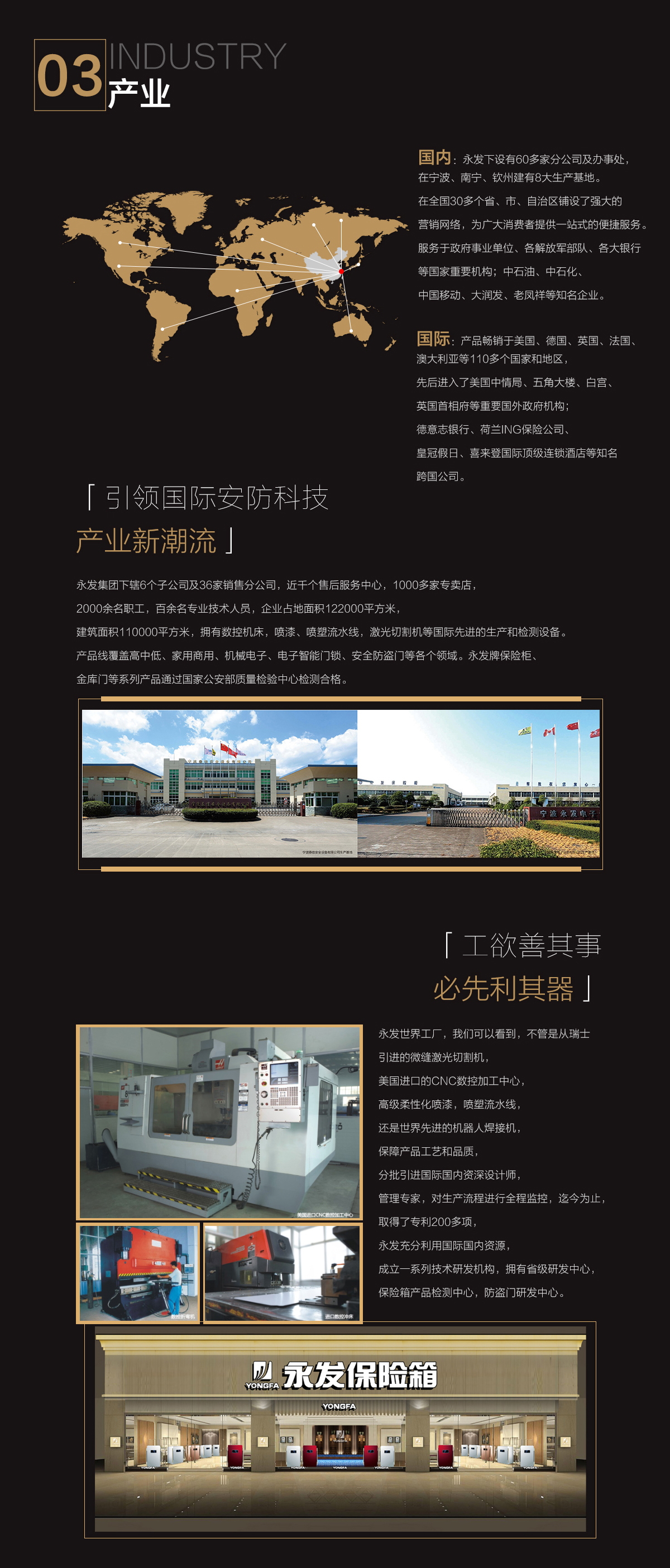 上海永發(fā)保險箱有限公司,集團公司是一家生產、銷售防盜保險箱、防火柜、銀行金庫門、家庭安全防盜報警系統(tǒng)、電子門鎖為主導產品的專業(yè)型安防生產企業(yè),是大型保險柜生產基地和出口創(chuàng)匯基地之一。公司成立于1988年,現(xiàn)有職工900多人,專業(yè)技術人員98名,其中高級職稱技術人員22名,有下屬6個工廠及三十六家銷售分公司。企業(yè)占地面積122000平方米,建筑面積110000平方米,擁有數(shù)控機床,噴漆、噴塑流水線,激光切割機等國際先進的生產和檢測設備。