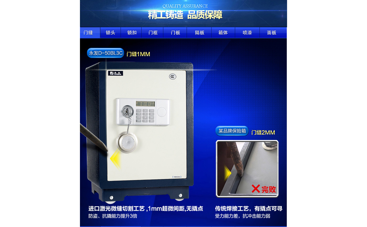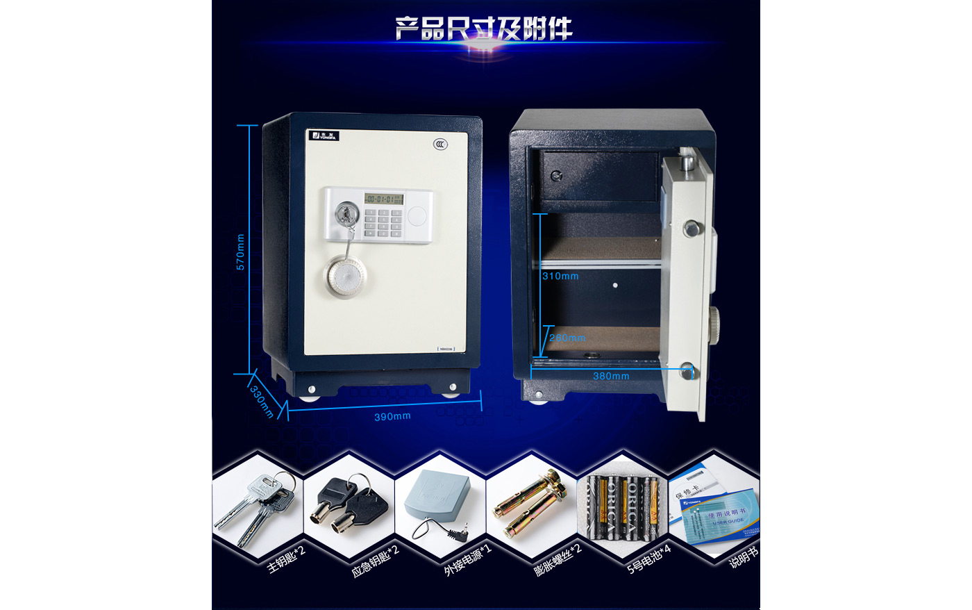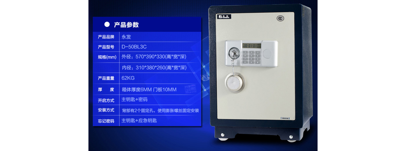 永發(fā)經(jīng)典電子系列3C認(rèn)證保險(xiǎn)箱D-50BL3C尺寸說明:570高*390寬*330深mm(含底座) 重量:62kg
