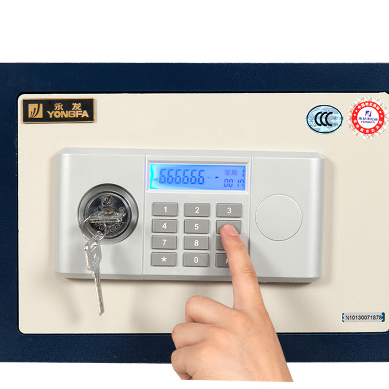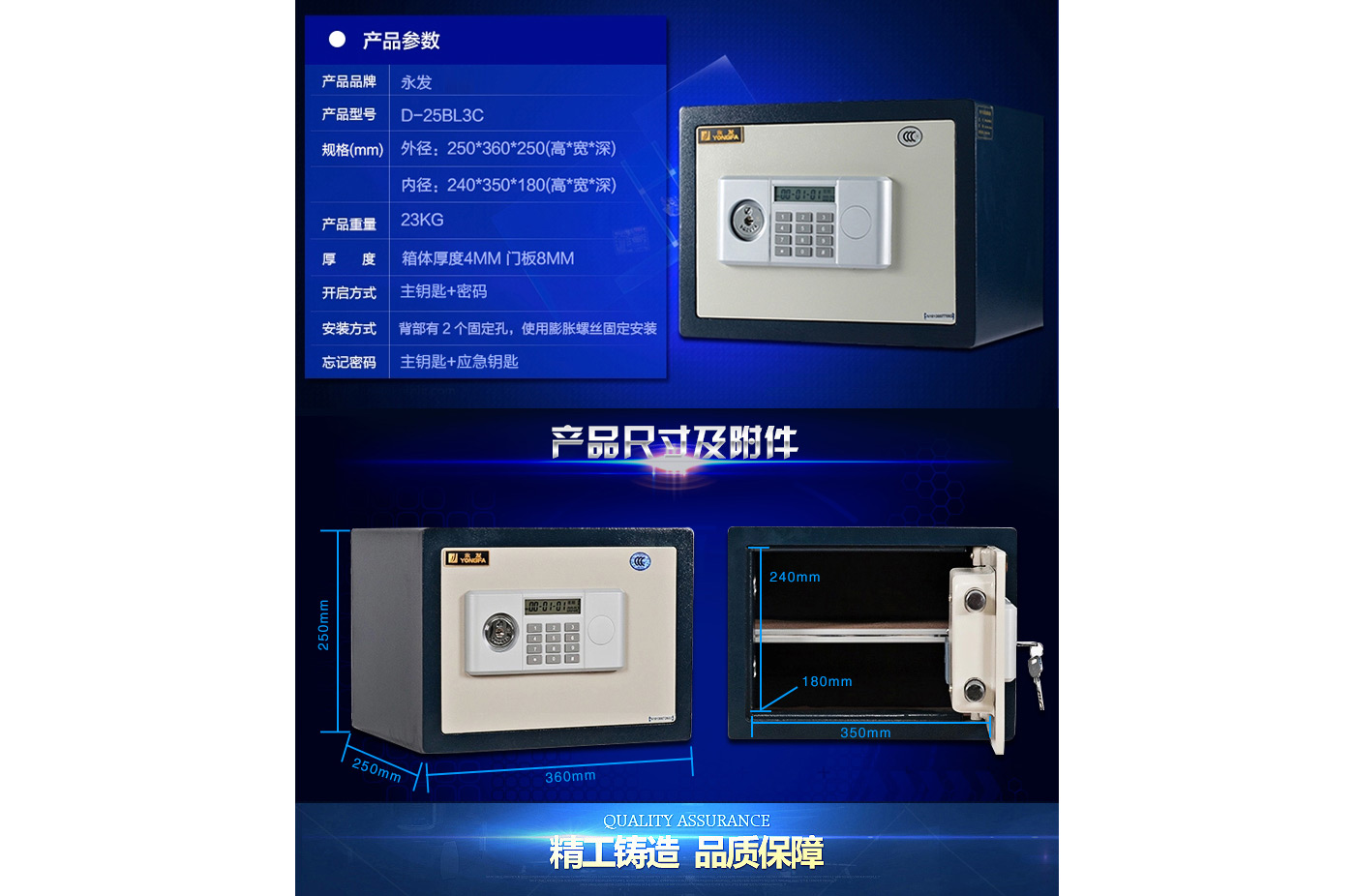 永發(fā)經典電子系列3C認證保險箱D-25BL3C尺寸說明:250高*350寬*250深mm(含底座) 重量:23kg