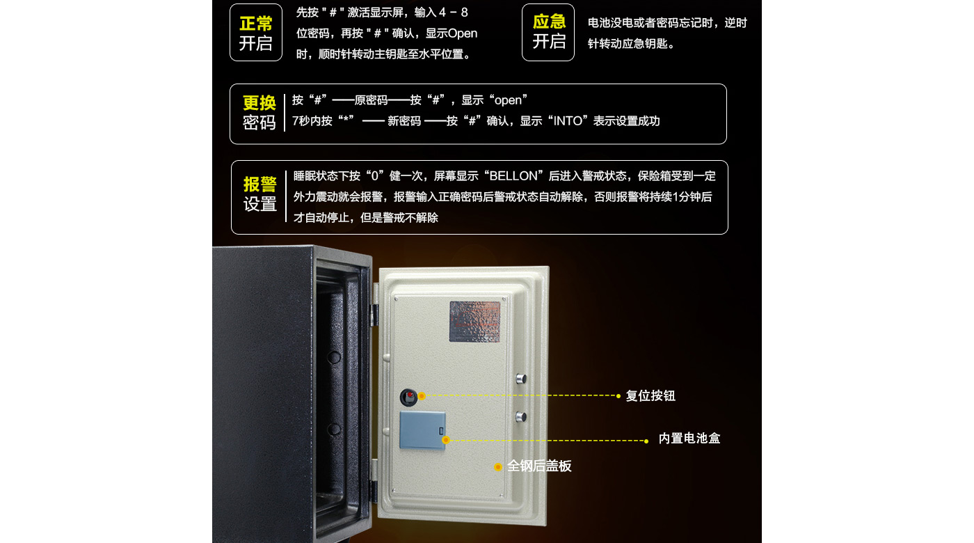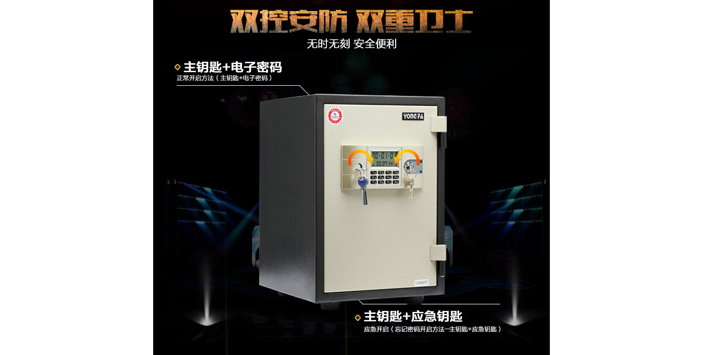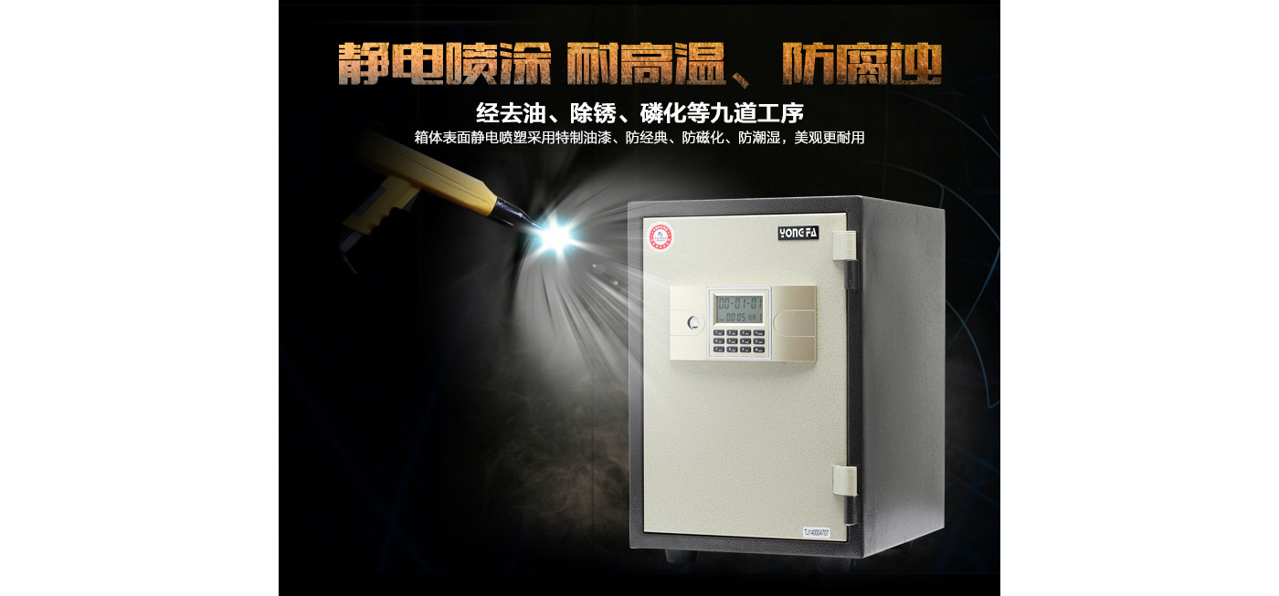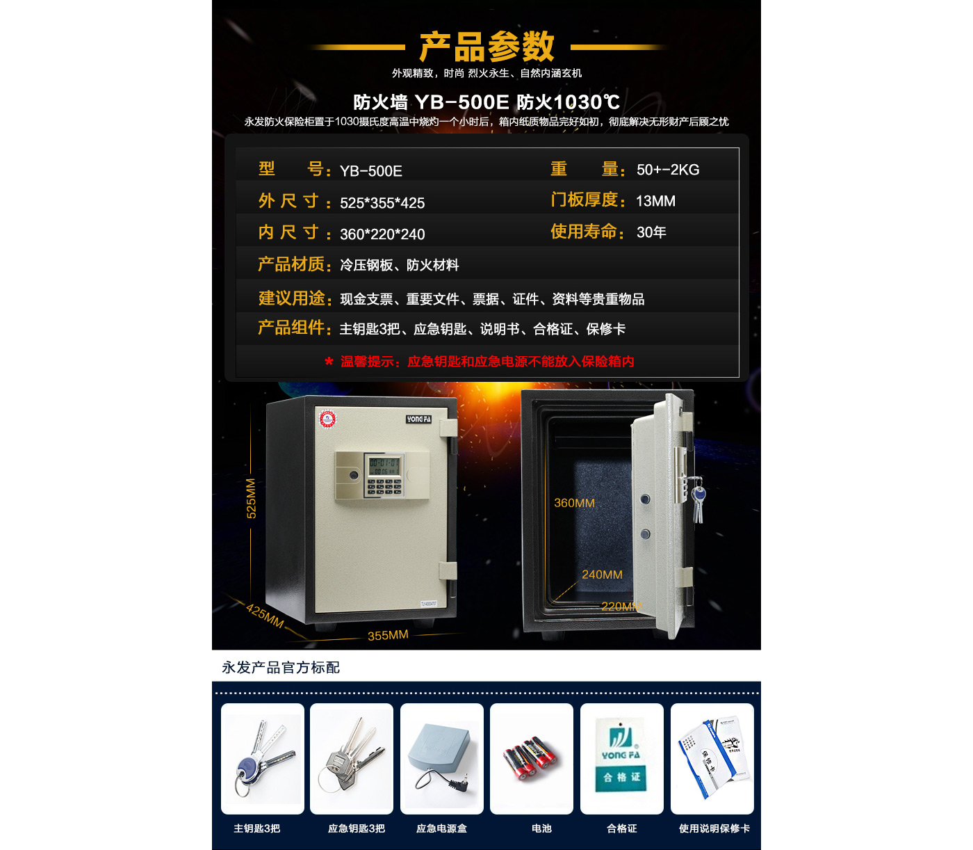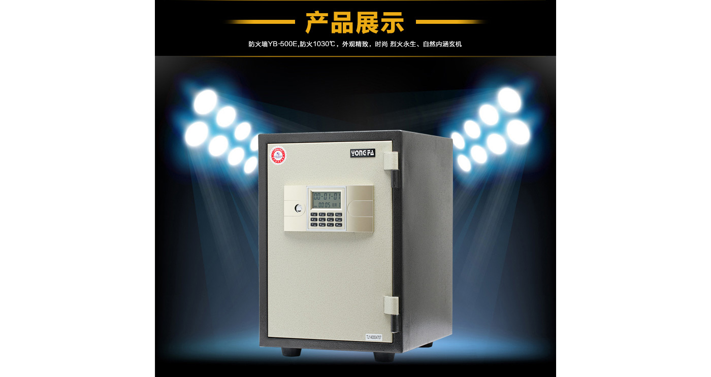 永發(fā)電子防火柜YB-500E尺寸說明:525高*355寬*425深mm(含底座) 重量:50kg