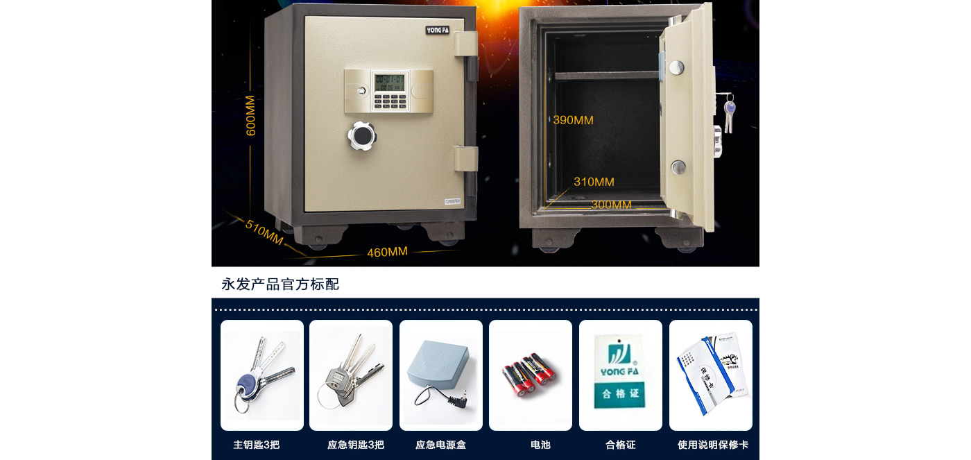 永發(fā)電子防火柜YB-530E尺寸說明:600高*460寬*510深mm(含底座) 重量:90kg