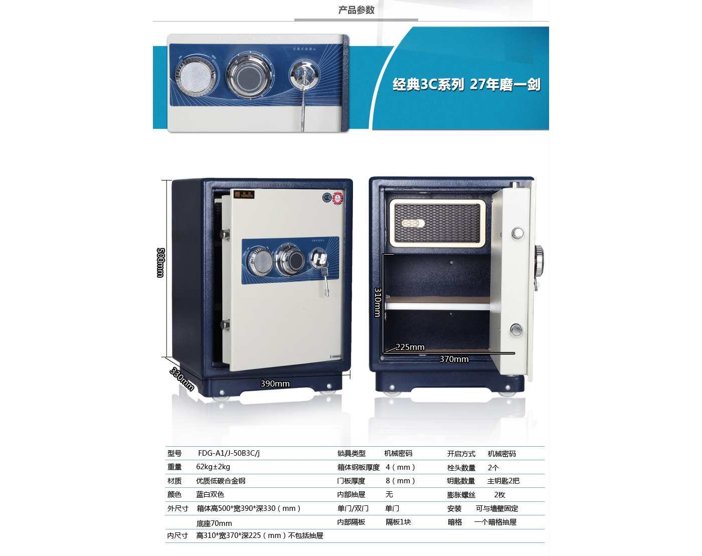 永發(fā)經(jīng)典機(jī)械系列3C認(rèn)證保險(xiǎn)箱J-50B3C尺寸說(shuō)明:570高*390寬*330深mm(含底座) 重量:62kg