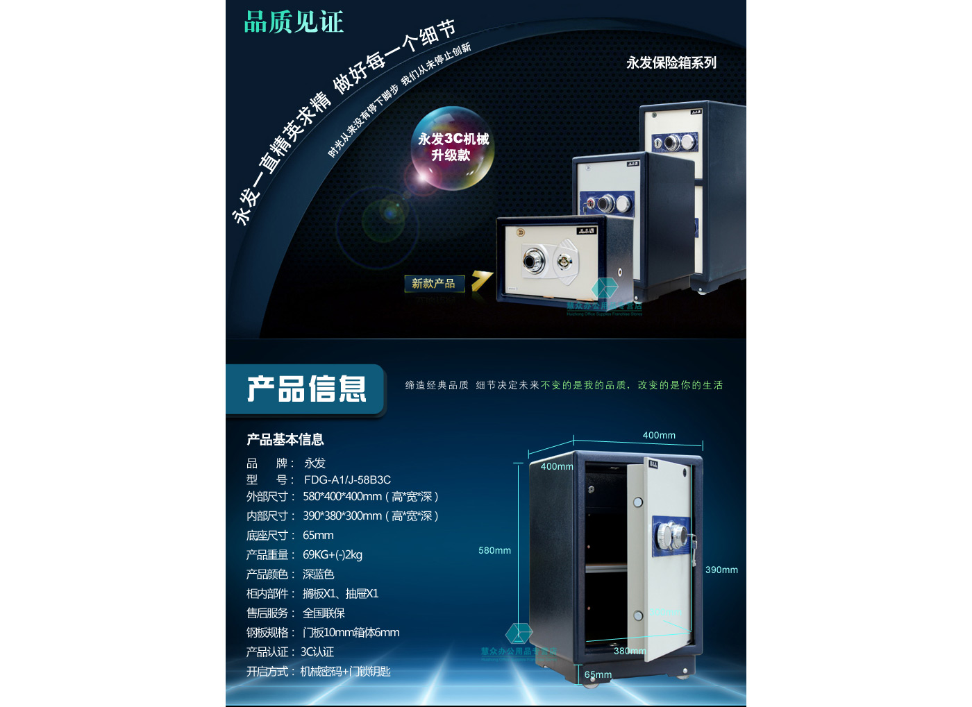 永發(fā)經(jīng)典機械系列3C認證保險箱J-58B3C尺寸說明:650高*400寬*400深mm(含底座) 重量:69kg