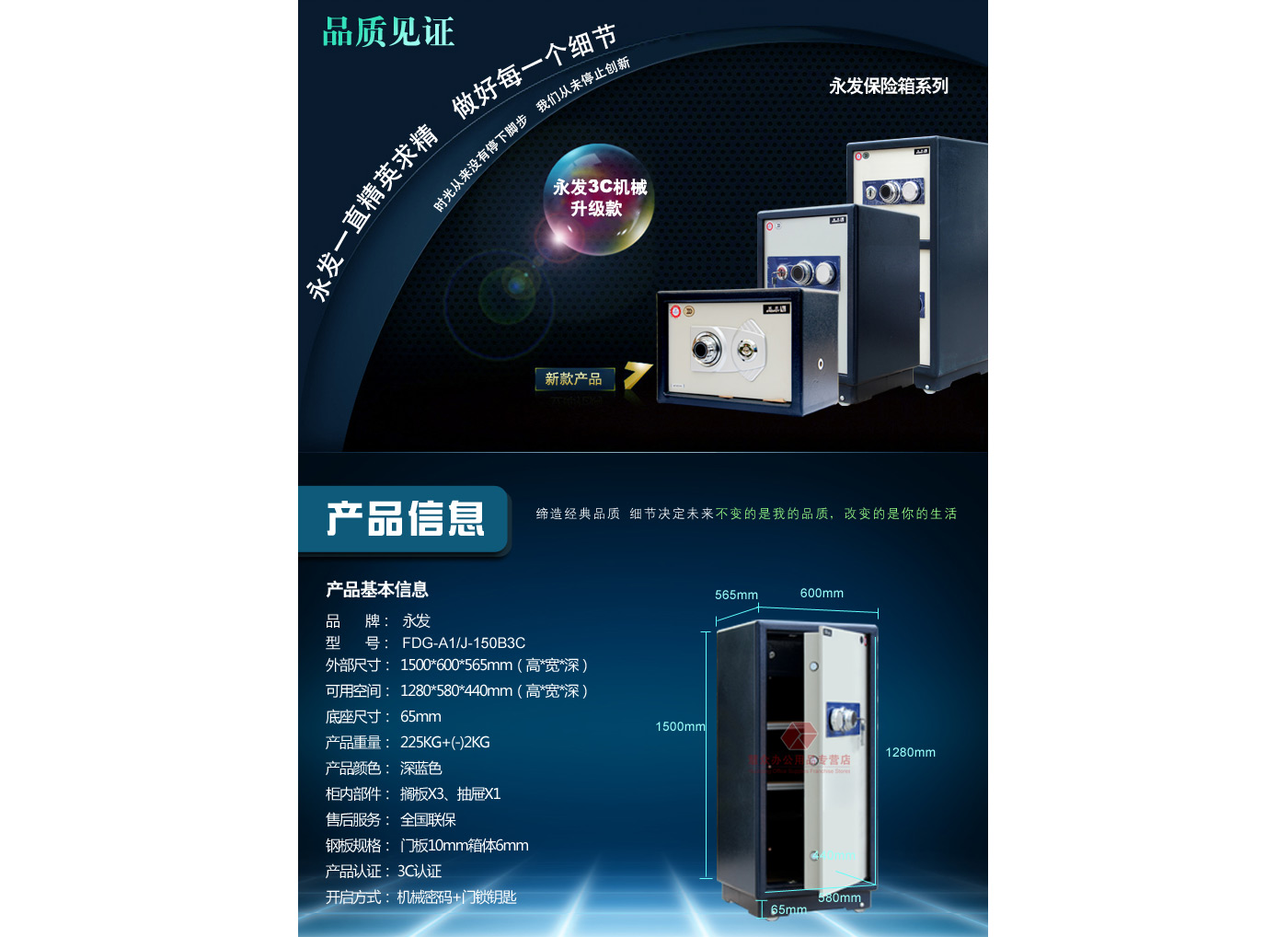 永發(fā)經(jīng)典機(jī)械系列3C認(rèn)證保險(xiǎn)箱J-150B3C尺寸說明:1570高*600寬*565深mm(含底座) 重量:256kg