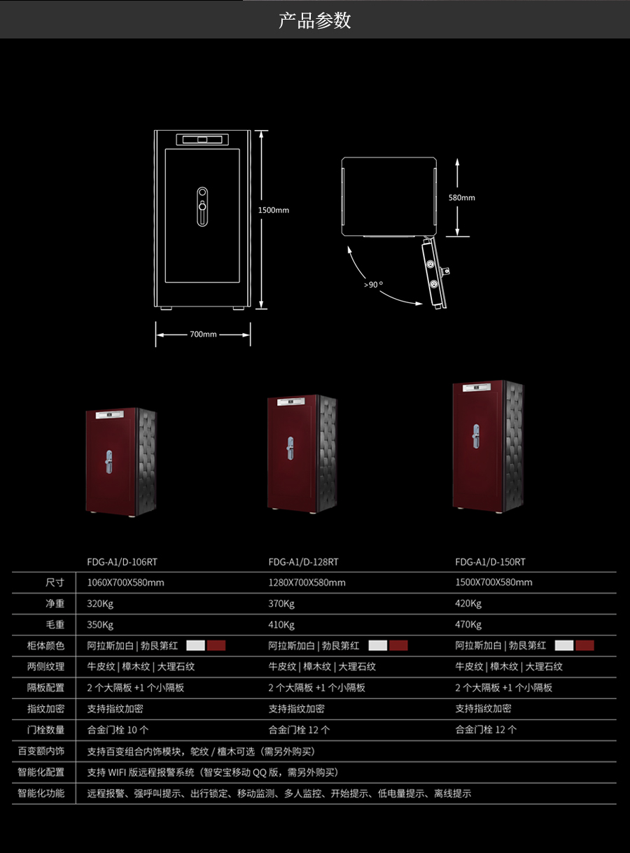 卡嘜御寶系列頂級3C認證保險箱D-128RT尺寸說明:1280高*700寬*580深mm(含底座) 重量:370kg